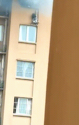 現(xiàn)場火勢兇猛,滾滾濃煙從窗口竄出,不時有物品往下掉落。一名女子試圖爬到窗外避險,她雙手抓住自家窗戶邊沿上,幾次試探后踩在樓下一戶人家的窗戶上,半蹲著身子,時不時調整姿勢,最終因為失手墜樓。