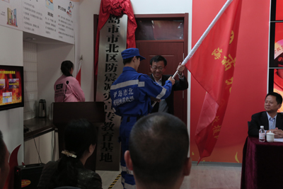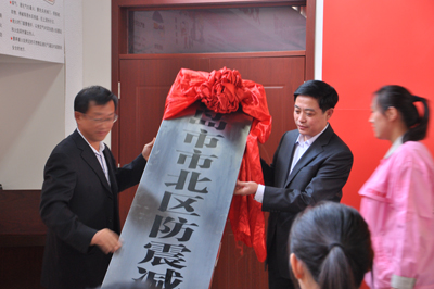 青島市地震局副局長(zhǎng)郭玉貴、市北區(qū)區(qū)委常委副區(qū)長(zhǎng)于洋共同為“市北區(qū)防震減災(zāi)宣傳教育基地”揭牌