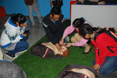 理工大學(xué)的學(xué)生在講解員的指導(dǎo)下學(xué)習(xí)心肺復(fù)蘇的正確方法