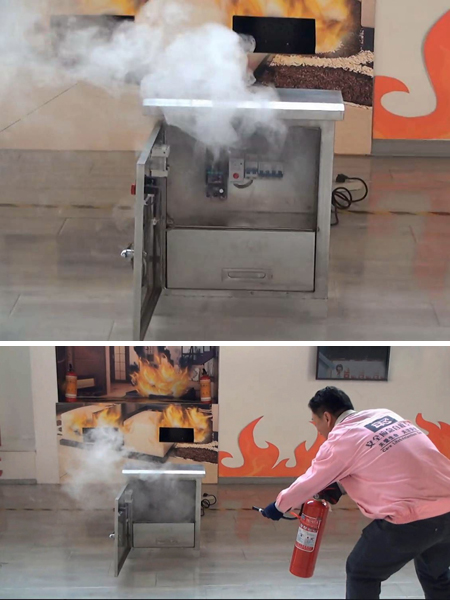 功能介紹:當電器發(fā)生火災時,有冒煙、發(fā)熱的現(xiàn)象,本裝置通過電子設備模擬火災場景,不僅環(huán)保無毒,而且內(nèi)部發(fā)煙裝置可重復使用,節(jié)省能源。逼真的場景使體驗者有一種身臨其境的感覺。體驗者通過滅火毯、滅火器等工具進行滅火的實際操作,掌握對電器火災發(fā)生時的應對技能。