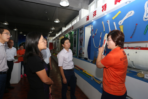 海麗雅集團(tuán)副總經(jīng)理、研發(fā)中心主任黃濤為陳黎明秘書一行匯報(bào)了企業(yè)質(zhì)量管理工作執(zhí)行情況:長(zhǎng)期以來(lái),在各級(jí)技術(shù)監(jiān)督部門的關(guān)心指導(dǎo)下,海麗雅集團(tuán)堅(jiān)持質(zhì)量強(qiáng)企,通過(guò)導(dǎo)入“卓越績(jī)效體系”、“ISO9001”、“CCC認(rèn)證”等管理體系,實(shí)行“首席質(zhì)量官制度”、“質(zhì)量基金制度”、“董事長(zhǎng)基金制度”,開展QC小組、五小(小建議、小革新、小攻關(guān)、小發(fā)明、小創(chuàng)造)等全體職工范圍的質(zhì)量管理活動(dòng),打牢質(zhì)量基礎(chǔ),提高質(zhì)量管理水平,實(shí)現(xiàn)了質(zhì)量和經(jīng)濟(jì)效益雙提升。公司相繼為國(guó)家載人潛水器“蛟龍?zhí)?rdquo;、國(guó)家海洋科考船“大洋一號(hào)”、“科學(xué)號(hào)”配套特種繩纜,打破了國(guó)外壟斷局面。2016年8月,我國(guó)深海科考進(jìn)入“萬(wàn)米時(shí)代”,本次科考中,公司為海底探測(cè)地震儀布放配套特種繩纜,并成功獲取完整地震剖面,保護(hù)了國(guó)家科研成果。在產(chǎn)品展廳,海麗雅集團(tuán)董事長(zhǎng)張旭明為陳黎明秘書一行展示了這些海洋科考的“功臣”繩纜。此外,董事長(zhǎng)張旭明為調(diào)研領(lǐng)導(dǎo)介紹了應(yīng)急產(chǎn)品及“體驗(yàn)式”應(yīng)急安全培訓(xùn)的創(chuàng)新發(fā)展成果。