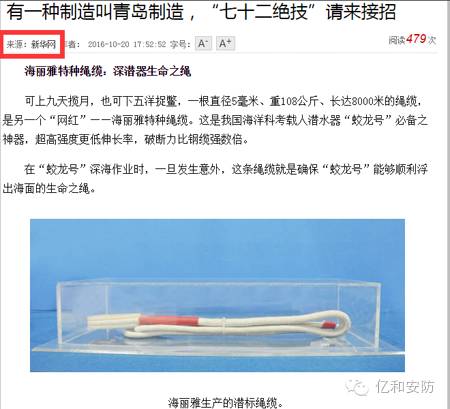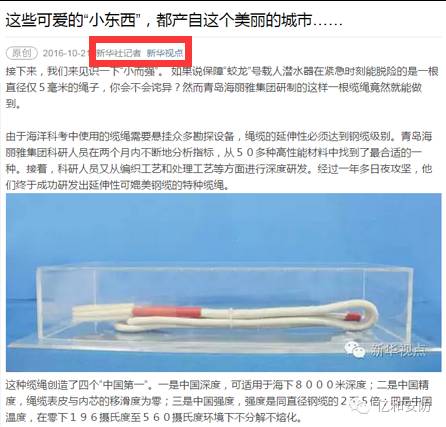 2016年10月20日新華社在《有一種制造叫青島制造,“七十二絕技”請來接招》中報(bào)道“海麗雅特種繩纜:深潛器生命之繩”。