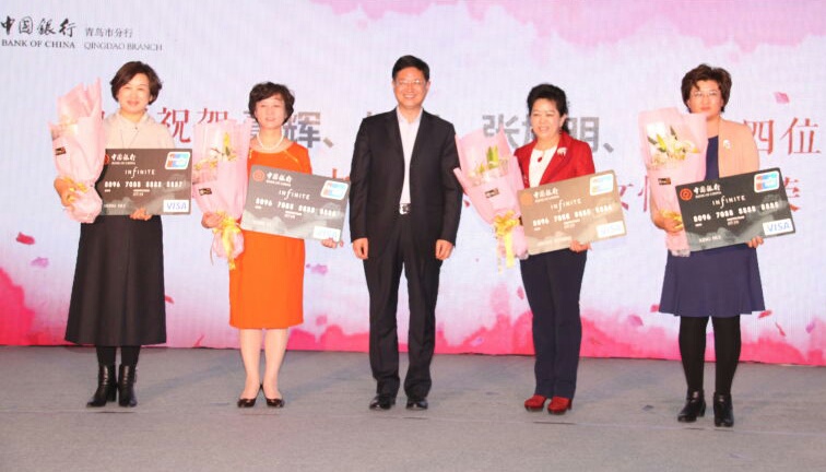 活動(dòng)現(xiàn)場,中國銀行青島支行紀(jì)委書記兼工會(huì)工委主任付連曄向獲得2016年度中國杰出創(chuàng)業(yè)女性稱號(hào)的張旭明、董輝、楊麗、邢慧四位優(yōu)秀的女企業(yè)家贈(zèng)送中國銀行無限卡表示祝賀。