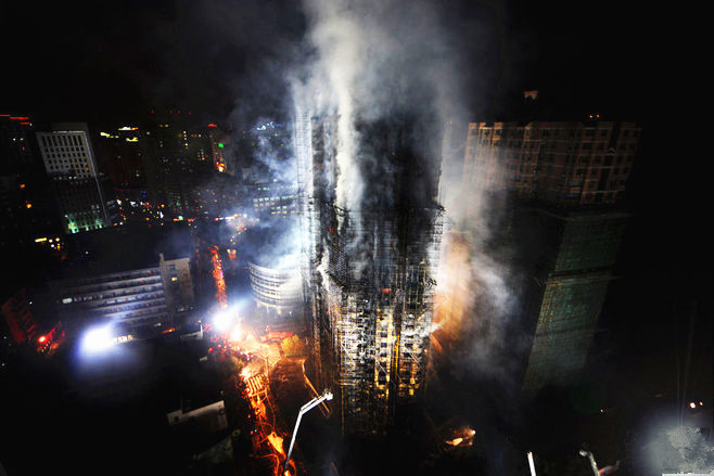 2010年11月15日,上海靜安區(qū)余姚路膠州路一正在進(jìn)行外立面墻壁施工的28層住宅由于4名電焊工無(wú)證違規(guī)操作,引燃周?chē)兹嘉铮_手架突發(fā)大火。在救援過(guò)程中,消防車(chē)云梯達(dá)不到著火大樓頂部的高度,云梯加上高壓水槍只能到達(dá)大樓三分之二的高度,火勢(shì)太大直升飛機(jī)不能靠近,阻撓了救援工作的順利進(jìn)行。最終導(dǎo)致58人遇難,70余人受傷,房產(chǎn)損失接近5億元人民幣。