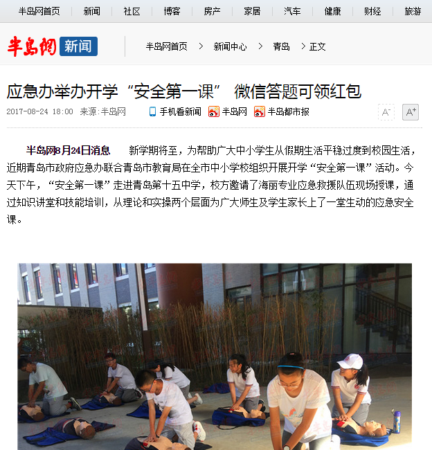 2017年8月24日,半島網(wǎng)對應急中心為青島第十五中學的新生進行開學安全培訓活動進行直播及報道