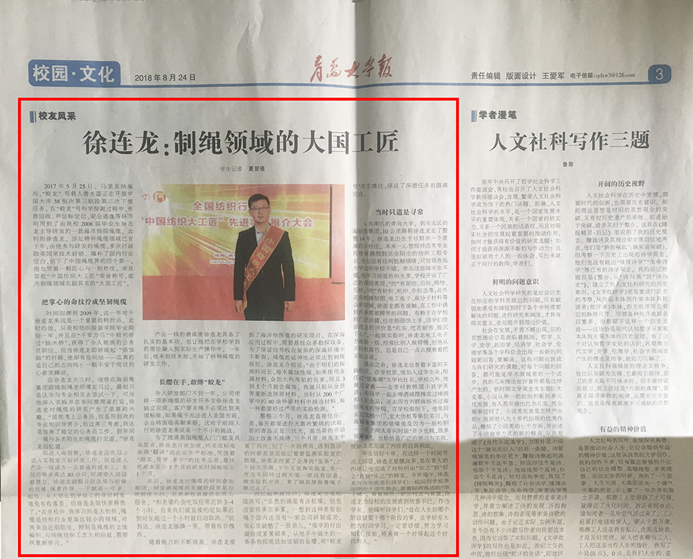 【青島大學(xué)報】以“徐連龍:制繩領(lǐng)域的大國工匠”為題,對徐連龍工匠精神進行報道。