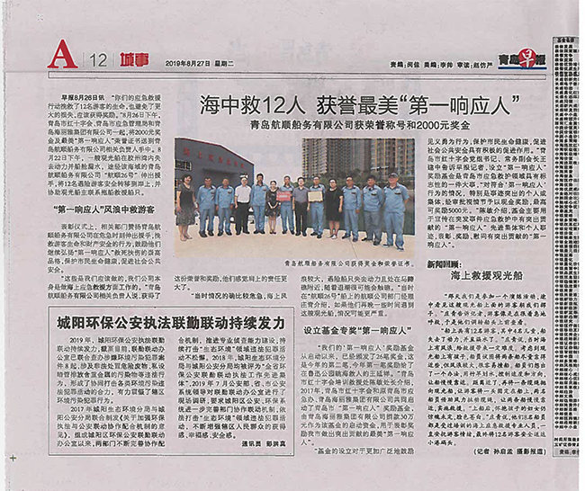 8月26日下午,青島市紅十字會,青島應(yīng)急管理局和青島海麗雅集團有限公司一起,將2000元獎金和最美 "第一響應(yīng)人"榮譽證書送到青島航順船務(wù)有限公司相關(guān)負(fù)責(zé)人手中。8月22日下午,一艘觀光船在膠州灣內(nèi)失去動力并船艙漏水,途徑該海域的青島航順船務(wù)有限有限公司,"航順26號"伸出援手,將12名遇險游客安全轉(zhuǎn)移到岸上,并協(xié)助觀光船主聯(lián)系拖船救援船只。