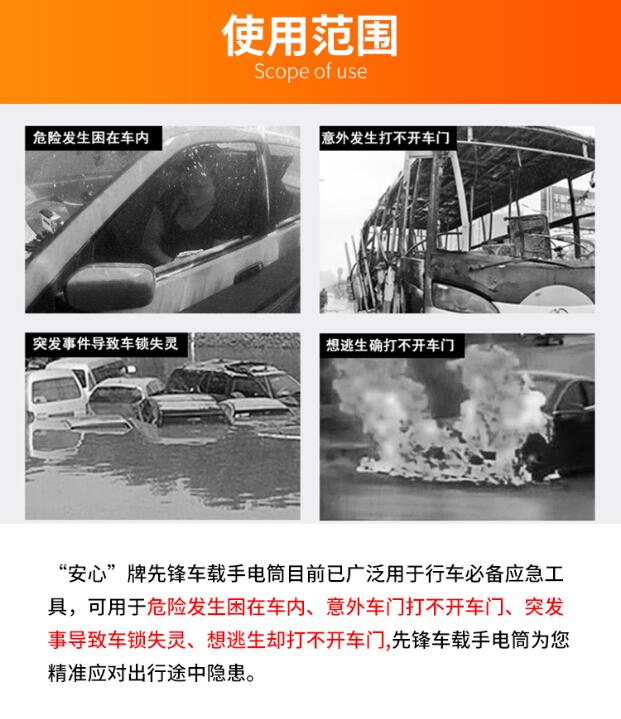 2、安全錘功能:配有帽蓋式安全錘,使用方便,可在緊急時刻車門打不開時砸碎車窗玻璃,進(jìn)行逃生(敲擊玻璃四角);