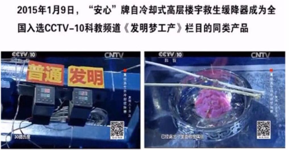 2015年1月9日,安心品牌自冷卻式高層逃生緩降裝置稱為全國入選CCTV-10科教頻道《發(fā)明夢工廠》欄目的上榜產(chǎn)品。