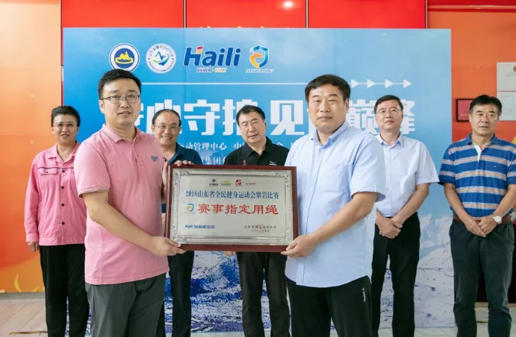 最后,山東省攀巖動(dòng)員協(xié)會(huì)會(huì)長(zhǎng)安慕雷為海麗雅集團(tuán)授牌--山東省攀巖比賽指定用繩。