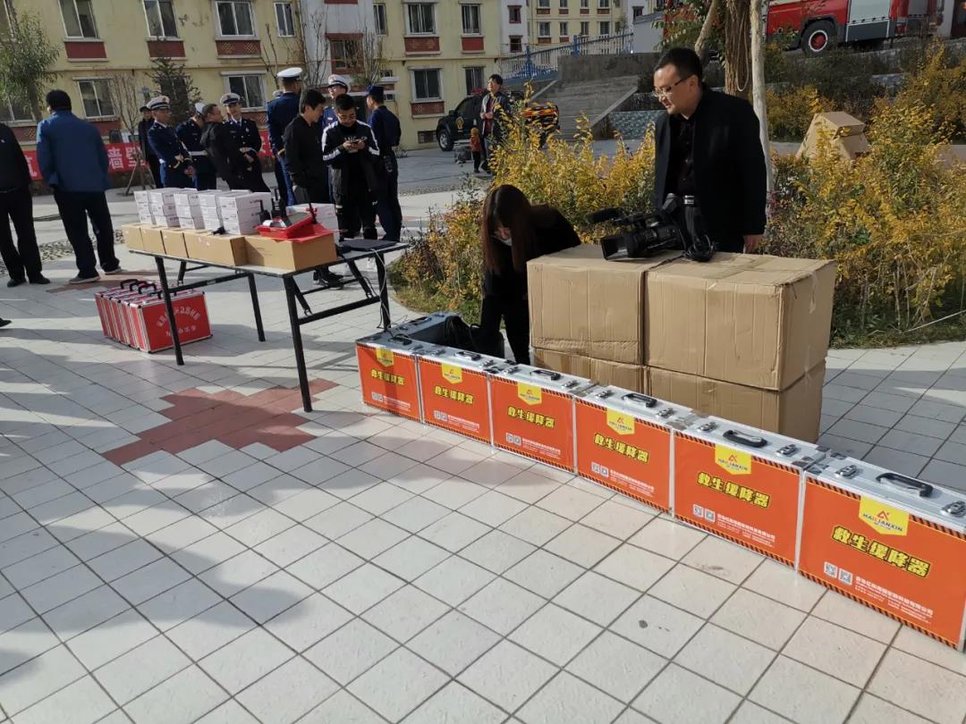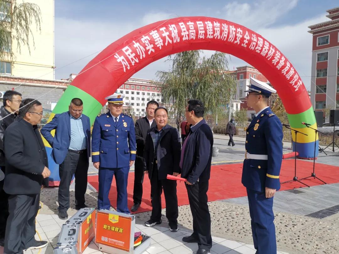 甘肅省武威市天祝縣消防大隊舉行“為您辦實事高層建筑消防安全器材發(fā)放儀式”,向社區(qū)居民發(fā)放“海麗安心”逃生緩降器。