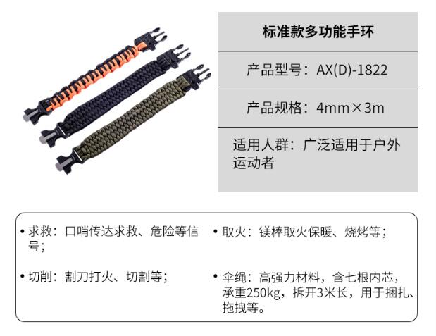 傘繩:高強(qiáng)力材料,包含七根內(nèi)芯,承重250kg,拆開3米長(zhǎng),用于捆扎、拖拽等。