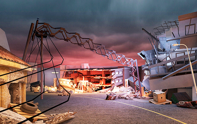 再現(xiàn)地震后,道路變形,有波浪狀也有斷裂上下錯層的場景。在道路兩側(cè)有建筑物倒塌,形成通道。體驗者從破損的通過穿過,到達一個相對安全的位置。在臨近出口處,設置一條斷掉的高壓電線掉落在地上,要求體驗者此處應該采取單腳跳的方式離開此區(qū)域。